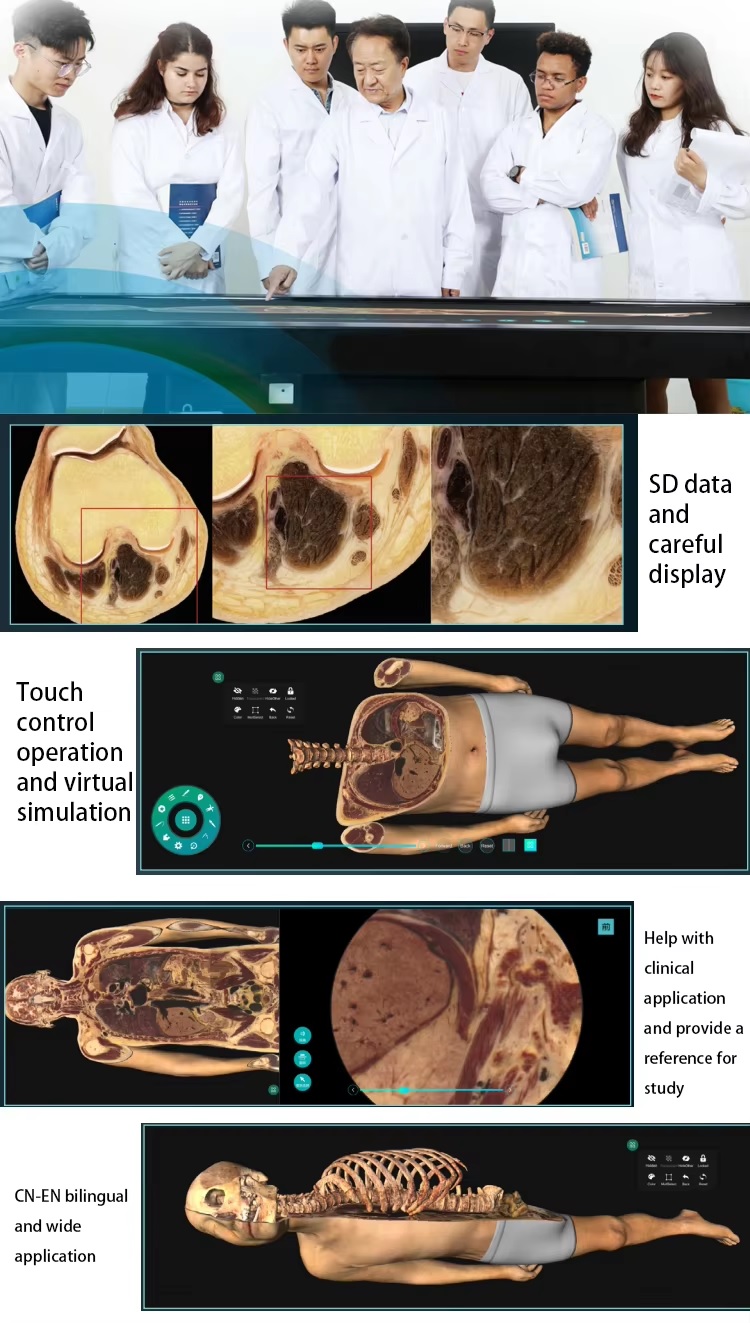 - Thao tác điều khiển cảm ứng của Bàn Giải phẫu có thể thực hiện việc cắt và quan sát cấu trúc cơ thể người theo các hướng và góc độ khác nhau ở các lớp khác nhau. Kiến thức về giải phẫu người, giải phẫu cục bộ và giải phẫu cắt ngang được tích hợp. Với phần cắt ngang cổ điển làm trục, máy cắt ảo được sử dụng để hiển thị liên tục.