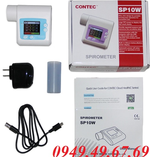- Máy đo chức năng hô hấp SP10W CONTEC cầm tay chuyên dùng cho các bệnh viện, phòng khám, phẩu thuật thẩm mỹ kiểm tra thể tích lồng ngực khi lượng hơi hít vào hoặc thở ra tại 1 thời điểm cấp thời.