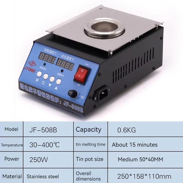 - Nồi hàn thiếc JF-508B được thiết kế để đáp ứng nhu cầu của quy trình hàn không chì. Nồi có cấu trúc chắc chắn với bộ phận gia nhiệt công suất cao, đảm bảo gia nhiệt nhanh và đồng đều. Nồi được chế tạo từ vật liệu chất lượng cao để chịu được nhiệt độ cao và chống ăn mòn, phù hợp với nhiều nhiệm vụ hàn công nghiệp khác nhau.