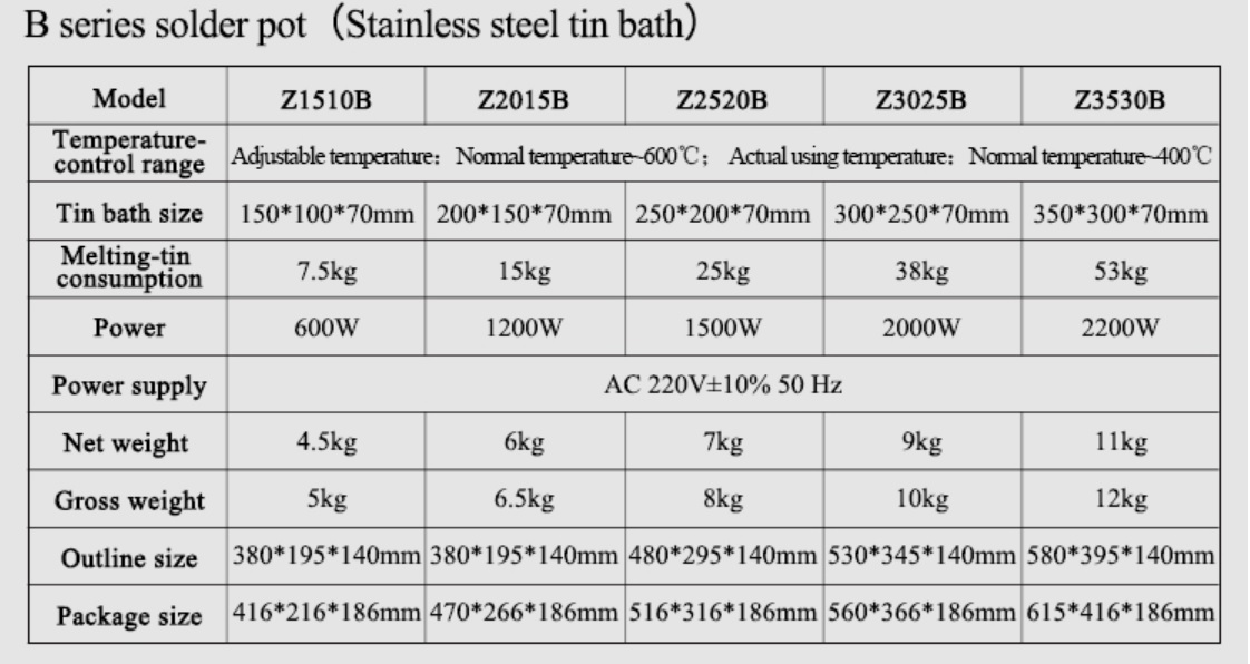 Thông số kỹ thuật bể hàn thiếc ZB1510B, ZB2015B, ZB2520B, ZB3025B, ZB3530B: