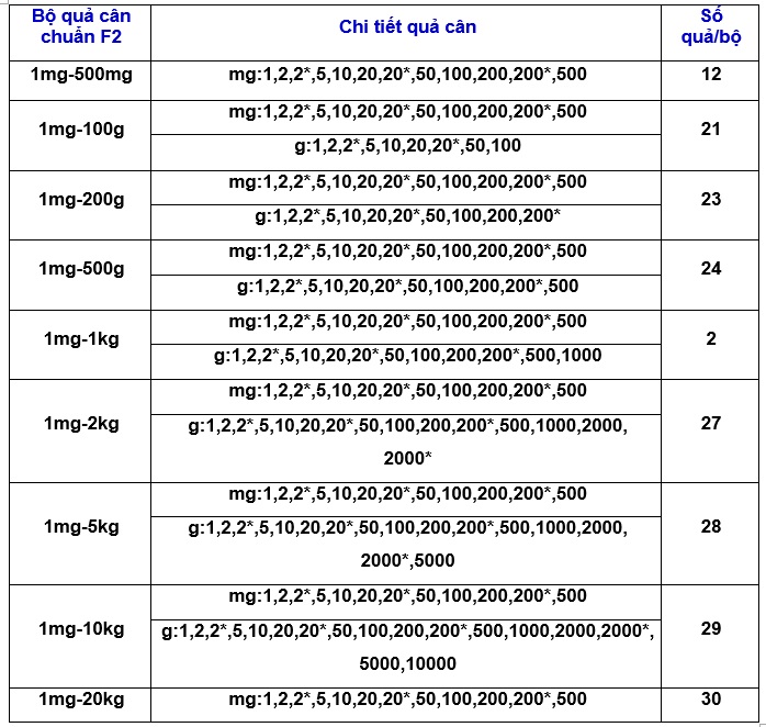 - Bộ quả cân chuẩn F2 bao gồm các bộ quả sau: 1mg-500mg, 1mg-100g, 1mg-200g, 1mg-500g, 1mg-500g, 1mg-1kg, 1mg-2kg, 1mg-5kg, 1mg-10kg, 1mg-20kg