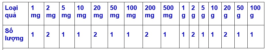 - Quả cân bao gồm: hộp đựng riêng từng quả cân, chia ngăn, chứa trong hộp bằng nhôm ( như hình) có chốt đóng, có nhung đen lót bảo vệ bên trong cho quả cân