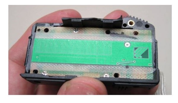 Bạn sẽ thấy trên bảng mạch có một số mối hàn bị bong ra. Đây chính là nguyên nhân dẫn đến hiển thị sai kết quả bởi lẽ, khung kim loại chạm vào bảng mạch.