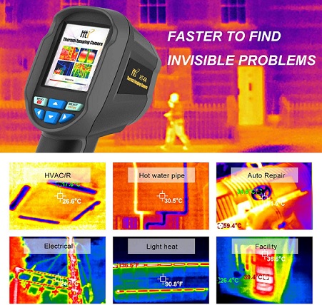 - Camera ảnh nhiệt hồng ngoại HT-04 được sử dụng rộng rãi trong y tế, khảo cổ, giao thông, nông nghiệp, v.v. Các vấn đề tiềm ẩn nhanh chóng được phát hiện trên màn hình. Điều này rất hữu ích cho người dùng nhanh chóng xác định vị trí con trỏ của điểm trung tâm và đo nhiệt độ.