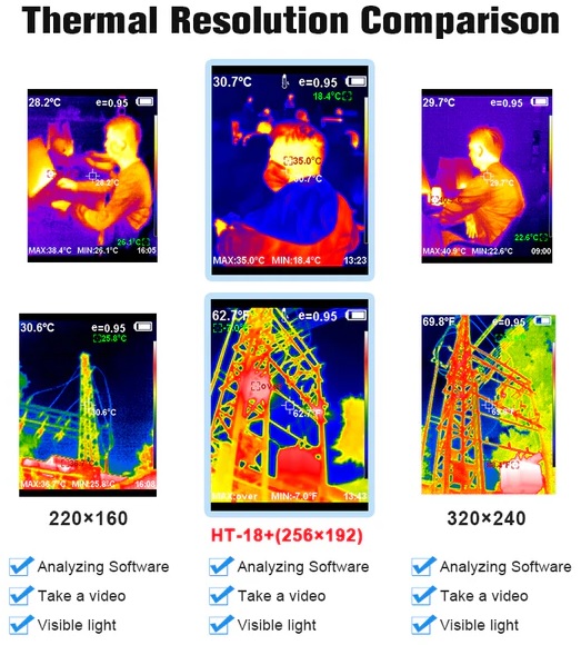 - Camera nhiệt độ HT-18+ với độ chính xác cao và độ phân giải 256 x 192 được cải thiện. Đây là Máy ảnh nhiệt hồng ngoại IR chất lượng chuyên nghiệp được sử dụng để kiểm tra nhà cửa, chữa cháy, nông nghiệp, sản xuất điện tử, nghiên cứu giao thông, khảo cổ học và bất kỳ hoạt động kinh doanh, sở thích hoặc khoa học nào khác khi yêu cầu đọc nhiệt độ chính xác đến 2,5 ° F.