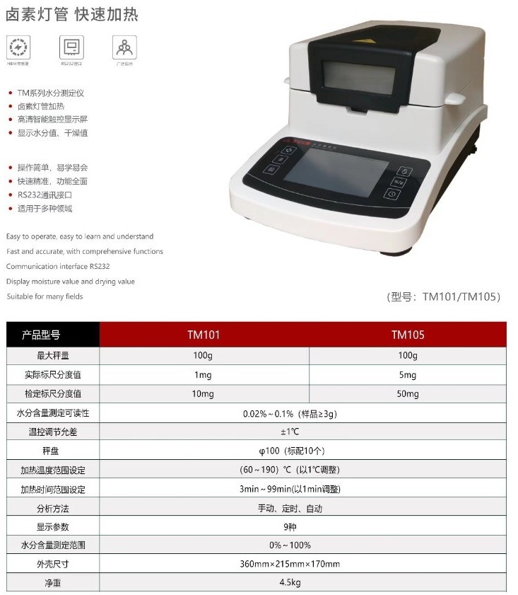 - Máy phân tích độ ẩm halogen Thiên Tân Tianma TM-101 là thiết bị xác định độ ẩm hiệu suất cao, sử dụng phương pháp gia nhiệt đèn halogen, có thể nhanh chóng làm nóng và kiểm soát chính xác nhiệt độ, hiển thị giá trị độ ẩm, giá trị sấy, thời gian đo và giá trị nhiệt độ.