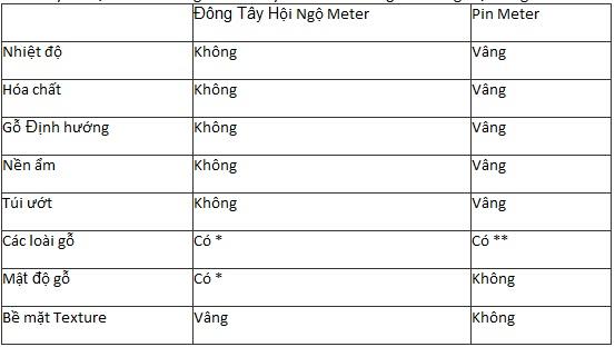 Một số yếu tố trong danh sách này, bạn có trực giác có thể hiểu được. Từ mét Đông Tây Hội Ngộ tạo ra một trung bình 3D của độ ẩm gỗ, định hướng của gỗ sẽ không ảnh hưởng đến bài đọc của họ.Mét pin bị ảnh hưởng bởi các túi ẩm ướt khi đi du lịch nhỏ đường dẫn hiện tại thông qua nó, ngay cả khi phần còn lại của gỗ khô hơn đáng kể. Thậm chí nhiệt độ sẽ ảnh hưởng đến sức đề kháng của gỗ đo bằng pin mét.