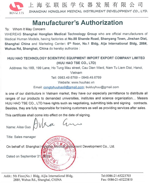 - Công ty “HUU HAO TSE CO., LTD” rất vinh dự là đại diện phân phối các sản phẩm General Docter của Honglian tại Việt Nam. Công ty Hữu Hảo cam kết sẽ cung cấp hàng hóa đúng chủng loại, số lượng cũng như quy cách và đảm bảo chất lượng hàng hóa của hãng Honglian. Đồng thời, chúng tôi xin cam kết sẽ hỗ trợ cho nhà thầu trong việc triển khai cung cấp hàng hóa, triển khai đào tạo cho chương trình giáo dục và cung cấp các dịch vụ bảo hành, bảo trì cho chủ đầu tư khi tiến hành ký kết hợp đồng.