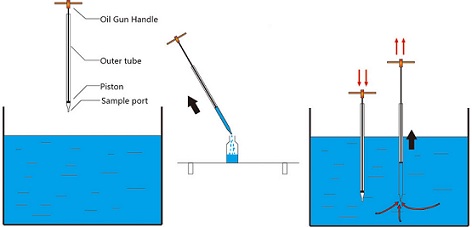 - Chèn vào vật liệu theo một góc nhất định. Đẩy thanh bơm xuống đáy, sau đó kéo thanh bơm trở lại để tạo chân không bên trong ống, làm cho dầu đi vào bộ lấy mẫu từ cổng đầu vào phía dưới.