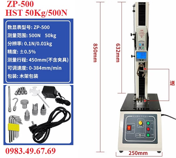 Thân máy đo lực tự động HST + màn hình kỹ thuật số 500N/50kg và bộ phụ kiện: