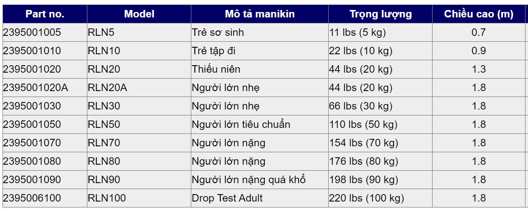 - Phiên bản người lớn RLN30, RLN50, RLN70 có chiều cao thấp hơn tiêu chuẩn (1.65m) đối với hạng cân 30kg, 50kg và 70kg