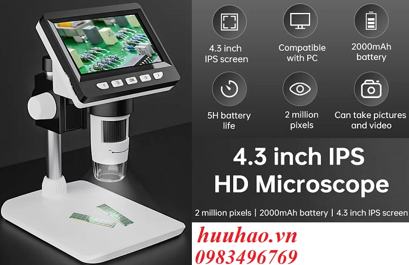 Kính hiển vi kỹ thuật số LCD Terino HD1000X-IPS 4,3 inch Độ phóng đại 50X-1000X Zoom HD 1080P 2 Megapixel Hợp chất Pin 2000 mAh Kính hiển vi USB 8 Đèn LED có thể điều chỉnh máy quay video kính hiển vi