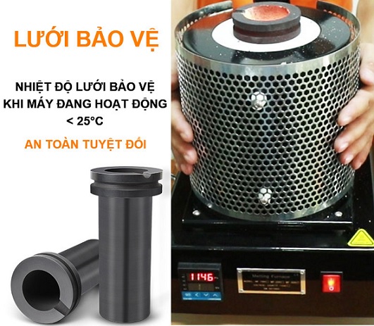 - Lò nấu vàng trang bị lưới bảo vệ, nhiệt độ khi máy hoạt động chỉ dưới 25 độ C nên không sợ bị bỏng.