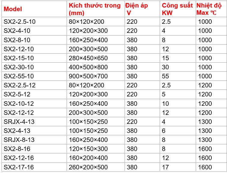 Thông số kĩ thuật Lò nung thí nghiệm chất lượng cao Series SX2