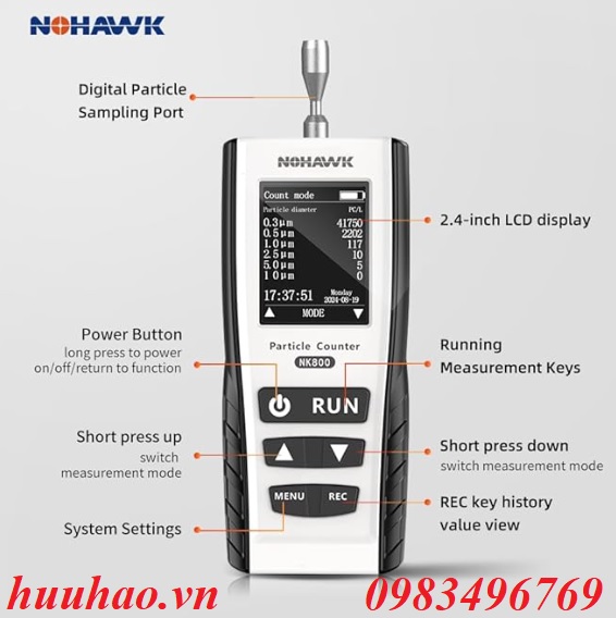 - Máy đếm hạt bụi di động và hiệu quả Nohawk là một công cụ thiết yếu để giám sát chất lượng không khí trong phòng sạch và các môi trường được kiểm soát khác. Thiết bị này có thể đo đồng thời sáu dải kích thước hạt khác nhau, bao gồm PM2.5, PM10, 0.3um, 0.5um, 1.0um, 2.5um, 5.0um và 10um, cung cấp dữ liệu toàn diện về mức độ ô nhiễm không khí.