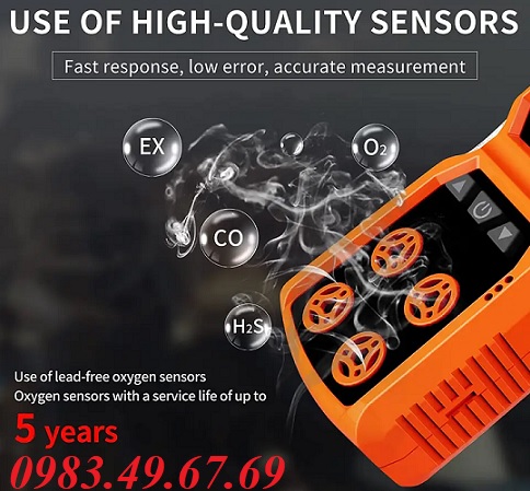 - Loại khí có thể phát hiện: CO (carbon monoxide), O2 (oxy), H2S (hydro sulfua), EX (chất dễ cháy)