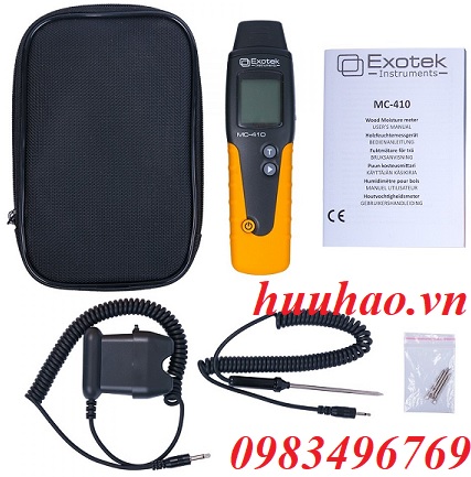 - Máy đo độ ẩm Exotek MC-410 là thiết bị đo độ ẩm của mùn cưa, gỗ, bê tông, giá trị đo được hiển thị dưới dạng %. Máy được cân chỉnh ở nhiệt độ 20 ºC . Khi sửa dụng que đo rời, giá trị độ ẩm sẽ được tự động bù nhiệt.