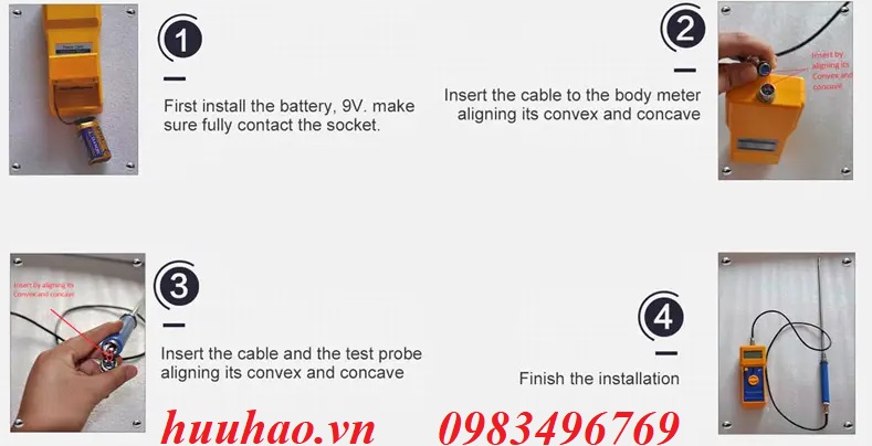 - Chuyển núm điều chỉnh sang "ON", và quan sát xem giá trị hiển thị có phải là 0.00 khi đầu dò không chạm vào bất kỳ vật nào không. Nếu không phải là 0.00, điều chỉnh núm "Zero" để đạt được giá trị zero. Chèn đầu dò vào mẫu cần đo. Hãy đảm bảo đầu dò tiếp xúc đầy đủ với mẫu, và ghi nhận giá trị độ ẩm sau khi chỉ số ổn định. Lưu ý rằng không nên có bất kỳ kim loại hoặc từ tính nào xung quanh.