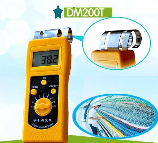 - Thiết bị đo độ ẩm bông, vải, sợi DM200T là chiếc máy đo độ ẩm được sử dụng để đo độ ẩm của các loại vật liệu sợi, ứng dụng phổ biến trong ngành công nghiệp may mặc.