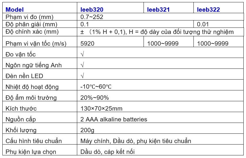 Thông số Máy đo độ dày bằng siêu âm LEEB320, LEEB321, LEEB322