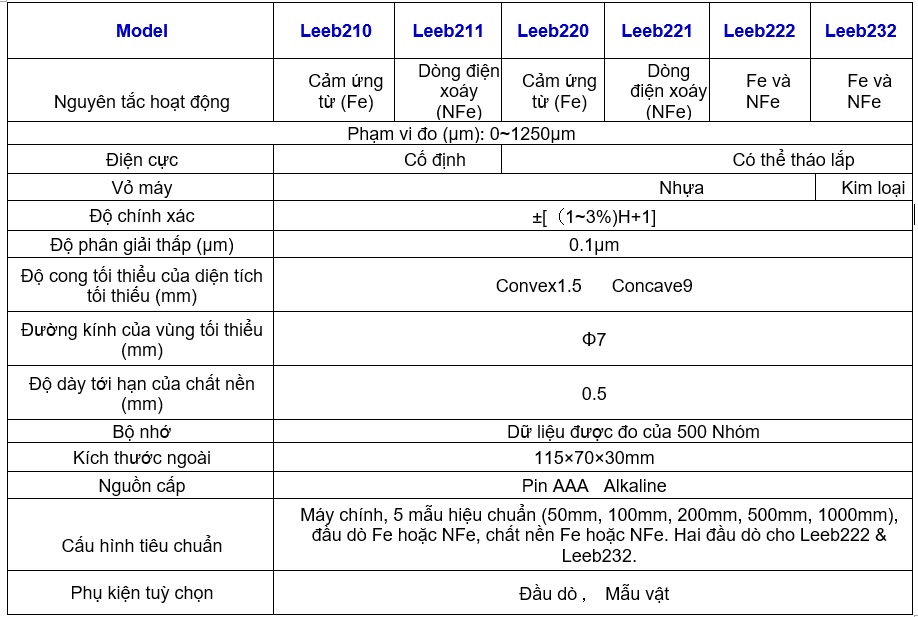 Máy đo độ dày lớp phủ Leeb: Leeb210, Leeb211, Leeb220, Leeb221, Leeb222, Leeb230, Leeb231, Leeb232, Leeb231, Leeb250, Leeb 251, Leeb252, Leeb253, Leeb250A, Leeb 251A, Leeb252A, Leeb262