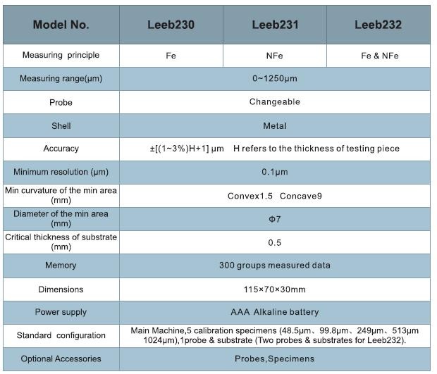 Máy đo độ dày lớp phủ Leeb: Leeb210, Leeb211, Leeb220, Leeb221, Leeb222, Leeb230, Leeb231, Leeb232, Leeb231, Leeb250, Leeb 251, Leeb252, Leeb253, Leeb250A, Leeb 251A, Leeb252A, Leeb262