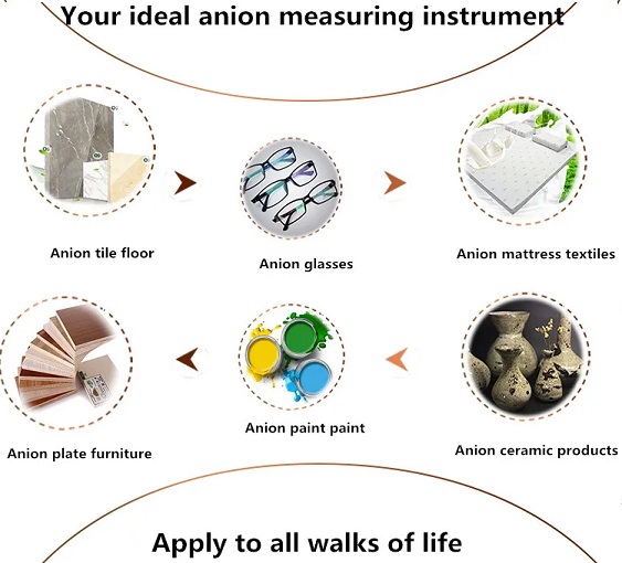 - Thiết bị đo anion L-100 lý tưởng của thiết bị đo lường thí nghiệm cho: Sàn gạch Anion, Kính Anion, Vải nệm Anion, Sản phẩm gốm Anion, Sơn Anion, Nội thất tấm Anion và các Ứng dụng cho mọi lĩnh vực đời sống