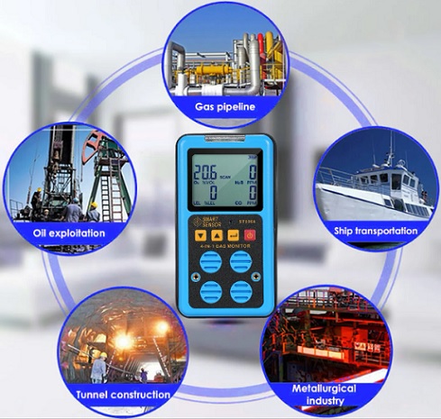 - Máy đo khí đa chỉ tiêu Smart Sensor ST8904 có thể được sử dụng để phát hiện các loại khí dễ cháy, dễ cháy và độc hại, và sự suy giảm oxy… Loại thiết bị này được sử dụng rộng rãi trong công nghiệp và có thể được áp dụng tại nhiều môi trường làm việc khác nhau, như trên giàn khoan dầu, để theo dõi các quy trình sản xuất và công nghệ mới nổi như như quang điện. Chúng cũng có thể được sử dụng trong chữa cháy. Trong khi nhiều đơn vị phát hiện khí tiêu chuẩn ban đầu được chế tạo để phát hiện một loại khí, các thiết bị đa chức năng hoặc đa khí hiện đại có khả năng phát hiện nhiều loại khí cùng một lúc. Một số máy dò có thể được sử dụng như các đơn vị riêng lẻ để giám sát các khu vực không gian làm việc nhỏ hoặc các đơn vị có thể được kết hợp hoặc liên kết với nhau để tạo ra một hệ thống bảo vệ