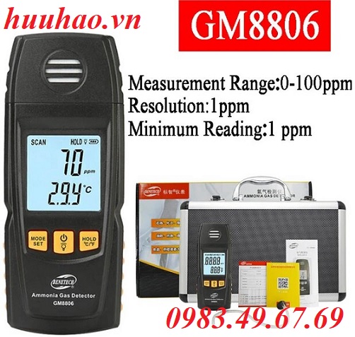 - Máy đo và phát hiện khí NH3 Benetech GM8806 là máy đo nồng độ Amoniac trong không khí. Được sử dụng để theo dõi chất lượng không khí và xác định kịp thời mức nguy hiểm của NH3. Máy được thiết kế có cảm biến điện hóa rất nhạy, báo động ở mức độ tập trung nguy hiểm cũng như đồng hồ đo nhiệt độ. Máy phân tích khí được thực hiện dưới dạng ergonomic với màn hình tương phản lớn và vỏ chống sốc.