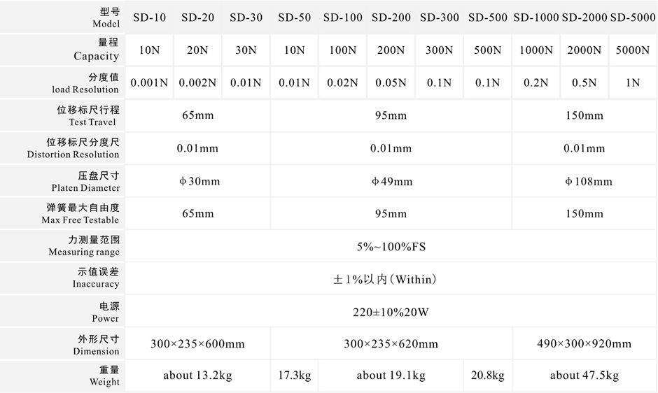 Thông số kỹ thuật máy kiểm tra lực kỹ thuật số dòng SD SUNDOO SD-10, SD-20, SD-30, SD-50, SD-100, SD-200, SD-300, SD-500, SD-1000, SD-2000, SD-5000