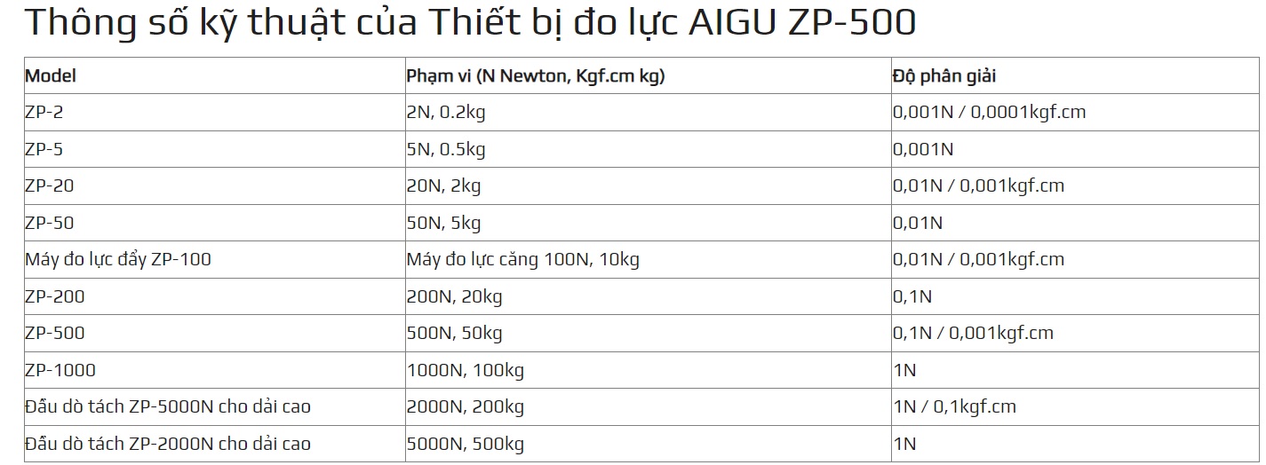Thông số kỹ thuật của thiết bị đo lực AIGU ZP-500