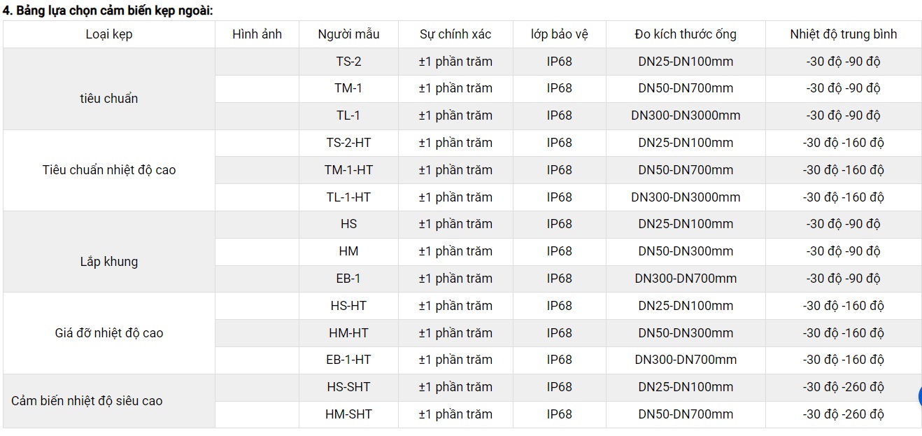 Bảng lựa chọn cảm biến kẹp ngoài:
