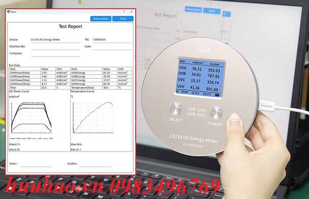 - Màn hình LCD lớn: Thiết bị có màn hình LCD lớn để theo dõi nhiệt độ và công suất tia UV theo thời gian thực, hiển thị đường cong thử nghiệm với giá trị cực đại và cực tiểu rõ ràng.