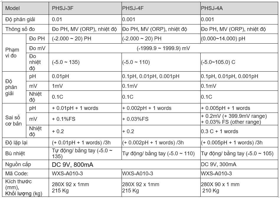 Thông số kỹ thuật máy đo pH để bàn PHSJ-3F, PHSJ-4F, PHSJ-4A:
