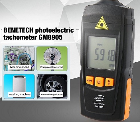 - Máy đo tốc độ vòng quay Benetech GM8905 được sử dụng để phát hiện tốc độ quay, vận tốc tuyến tính hoặc tần số của động cơ. Thiết bị đo tốc độ vòng quay Benetech GM8905 được sử dụng rộng rãi trong động cơ, quạt, máy giặt, dệt, ô tô, máy bay, tàu và các ngành công nghiệp khác.