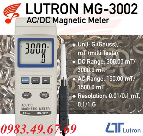 - Máy đo từ trường LUTRON MG-3002 là thiết bị đo điện từ trường sử dụng để kiểm tra từ tính của môi trường làm việc. Máy có phạm vi hoạt động cực rộng, hỗ trợ cả dòng AC và DC. Máy đo từ trường Lutron MG-3002 hỗ trợ cả đơn vị G (Gauss) và đon vị mT (milli Tesla).