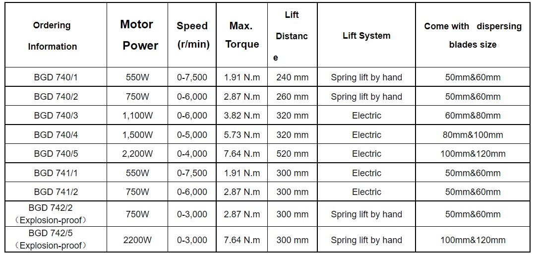 Thông tin kỹ thuật máy khuấy phân tán biuged BGD 740, BGD 741