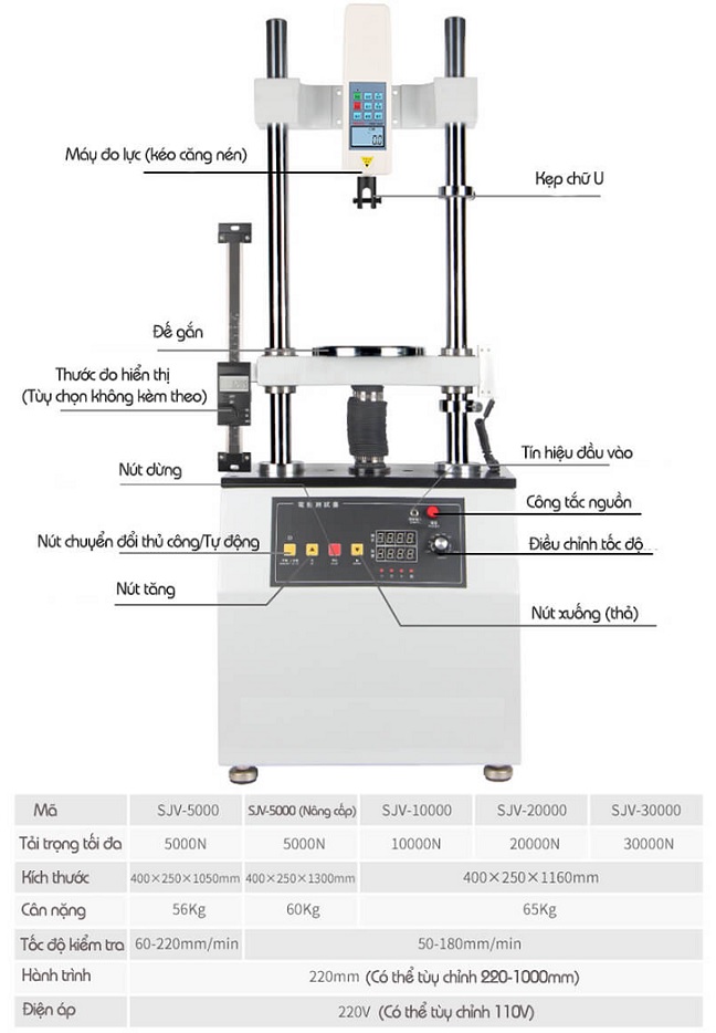 - Tải trọng thử nghiệm tối đa: SJV-5000N, SJV-10000N, SJV-20000N, SJV-30000N.