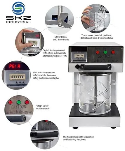 - Máy phân rã bột phòng thí nghiệm SKZ1025 (cũng được gọi là máy khuấy sợi tiêu chuẩn, thiết bị kiểm tra bột tiêu chuẩn), phù hợp cho việc phân rã ướt bột trong phòng thí nghiệm.