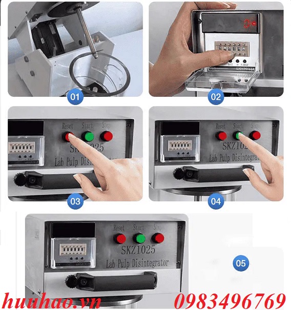 ① Gắn chặt máy ② Điều chỉnh số vòng quay. ③ Đặt lại máy. ④ Bắt đầu máy. ⑤ Nếu muốn tạm dừng, bạn có thể dừng máy phân rã bột giấy.