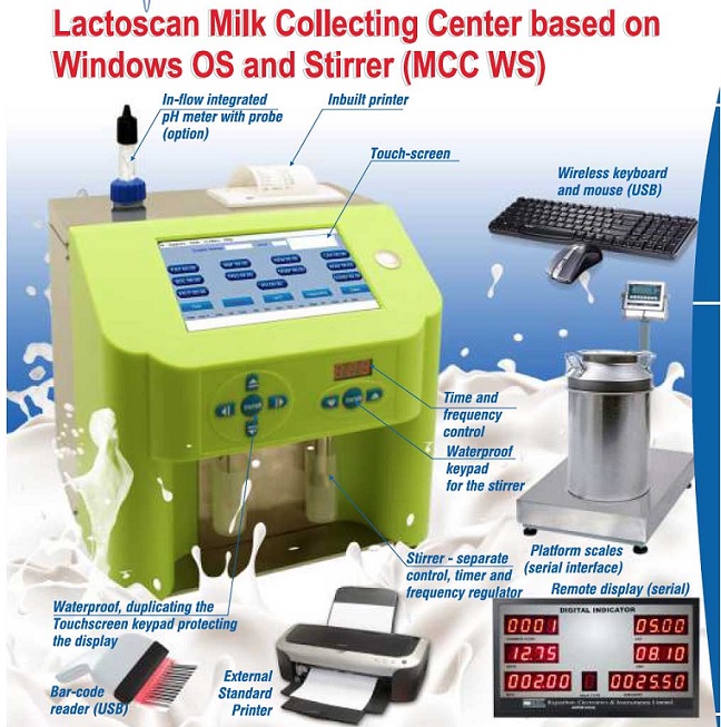 - Máy phân tích sữa Lactoscan MCC WS là loại cao cấp của hãng MILKOTRONIC cho kết quả nhanh với 2 lựa chọn 30 giây hoặc 50 giây với độ chính xác cao, thích hợp cho công việc phân tích và kiểm nghiệm sữa. Máy tích hợp máy in nhiệt và có thể nối với máy in nhiệt qua cổng RS 232