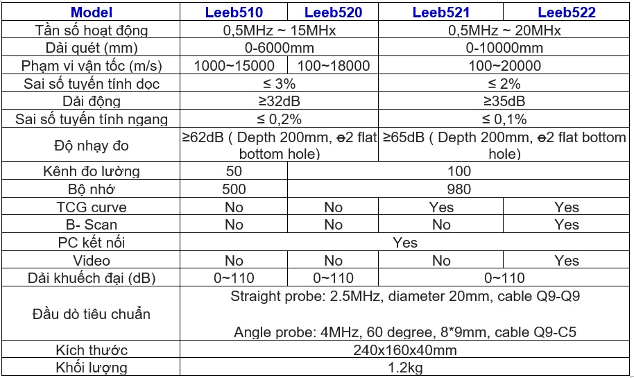 Thông số kỹ thuật Máy siêu âm khuyết tật Leeb510, Leeb520, Leeb521, Leeb522