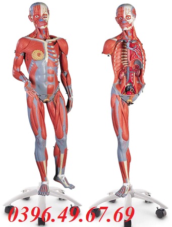 - Mô hình hệ cơ nam/nữ kích thước thật gồm 45 phần, Cao hơn 140cm, bản sao người có kích thước bằng 3/4 người thật này mô tả cơ bắp sâu và bề ngoài cùng với các dây thần kinh, mạch, mô và cơ quan chính của cơ thể một cách chi tiết tinh tế.