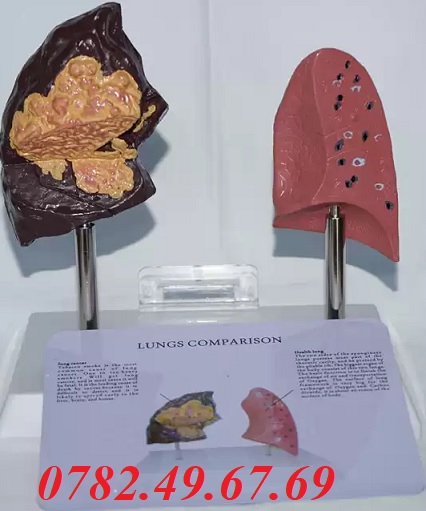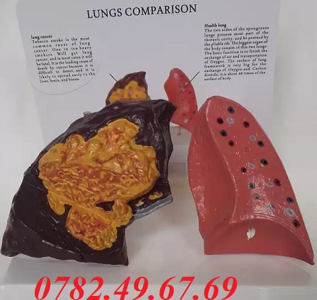 - Mô hình bệnh lý phổi mô tả hình ảnh 1 bên phổi bình thường và 1 bên là các bệnh lý hay gặp ở phổi như: viêm phổi, ung thư phổi, giãn phế nang... thích hợp cho việc giảng dạy và học tập bệnh học Nội khoa các bệnh về hô hấp, cũng có thể trưng bày ở các phòng khám hoặc dùng cho mục đích tuyên truyền tác hại của thuốc lá.