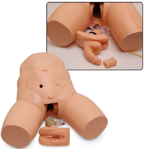 + Thực hành định vị lỗ thông niệu đạo và đặt ống thông tiểu; môi âm hộ giống thật đóng lại trên các lỗ âm đạo và niệu đạo, đồng thời mô mềm và dẻo để dễ dàng thực hành dùng ngón cái và ngón trỏ