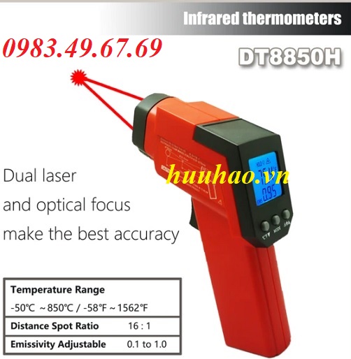 - Nhiệt kế hồng ngoại DT8850H có khả năng đo những nguồn nhiệt từ xa, không cần tiếp xúc trực tiếp với độ chính xác cao và nhanh chóng. Nhiệt kế hồng ngoại DT8850H sử dụng kỹ thuật đo bằng hồng ngoại, kết hợp với kỹ thuật laser để định vị nguồn nhiệt.