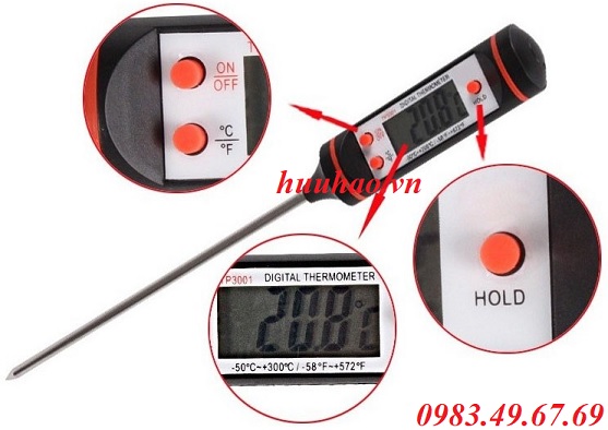 - Nhiệt kế đo nhiệt độ dạng que đầu nhọn PT3001 dùng để đo nhiệt độ của thức ăn, nước uống như thịt, cá, sữa, cà phê... trong quá trình nấu nướng.