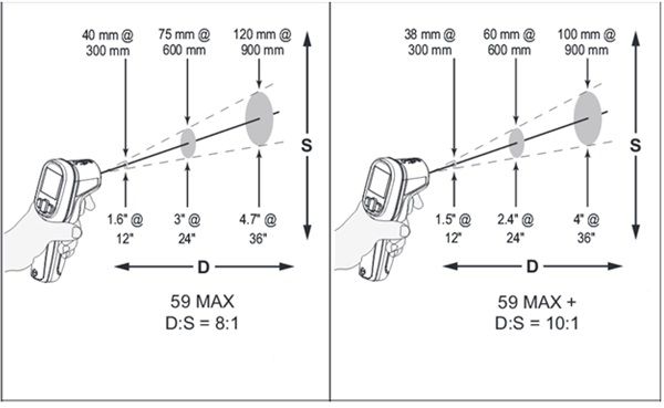 Ta có thiết bị Fluke 59 MAX với thông số khẩu độ quang học D:S là 8:1. Đo một vật có đường kính là 40mm thì ta tính theo công thức là: 40mm x 8/1 = 320mm. Vậy là khoảng cách cần đo nhỏ hơn hoặc bằng 320mm là được. Nếu khoảng cách đo lớn hơn khoảng cách tính ở trên thì kết quả sẽ không được chính xác.