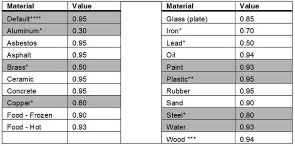 Một yếu tố nữa ảnh hưởng đến kết quả là vật liệu cần đo, vì vậy nhà sản xuất đã đưa ra một bảng chỉ số bức xạ điện từ của một số vật để dể dàng chuyển đổi hệ số bức xạ cho thiết bị nhầm đo được kết quả chính xác hơn. Thông thường nhà sản xuất sẽ mặc định cho thiết bị là 0.95.